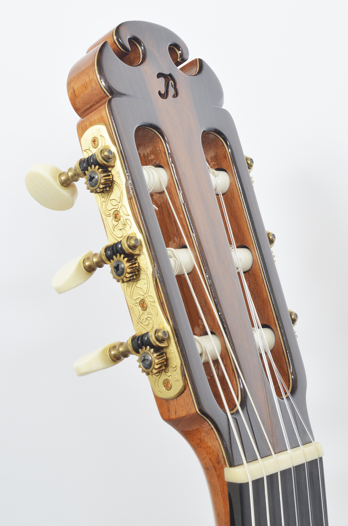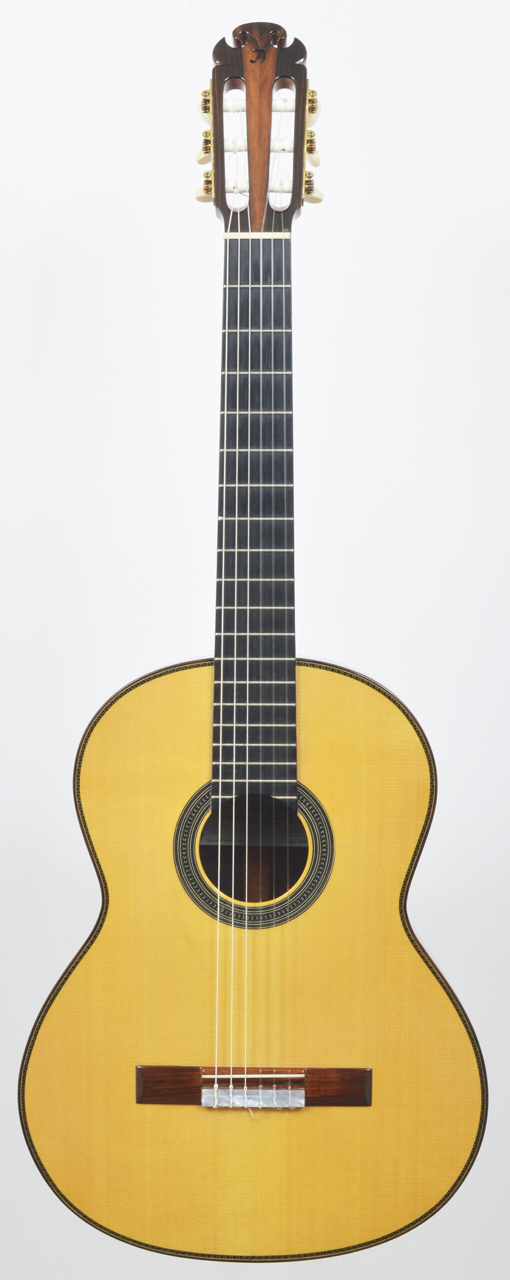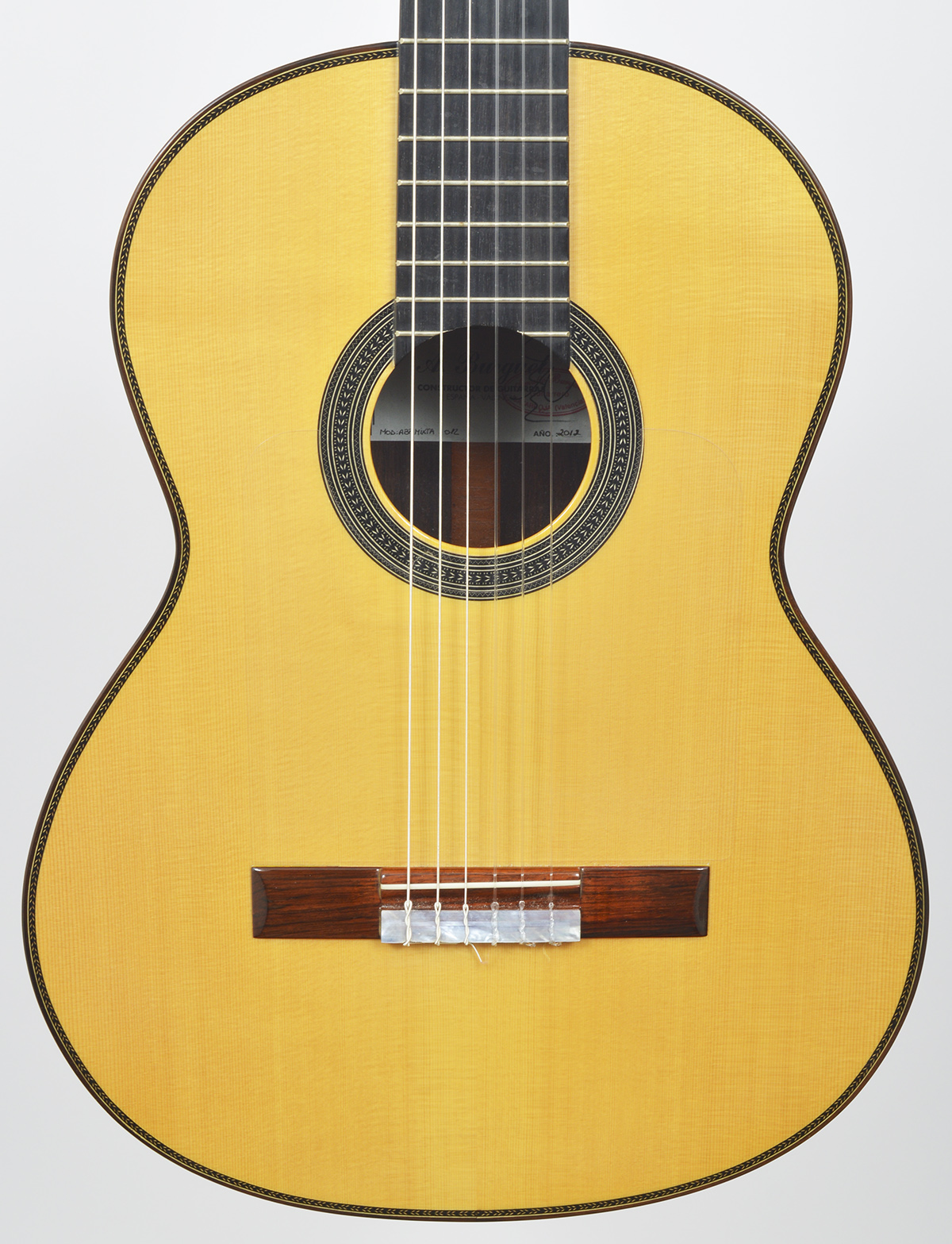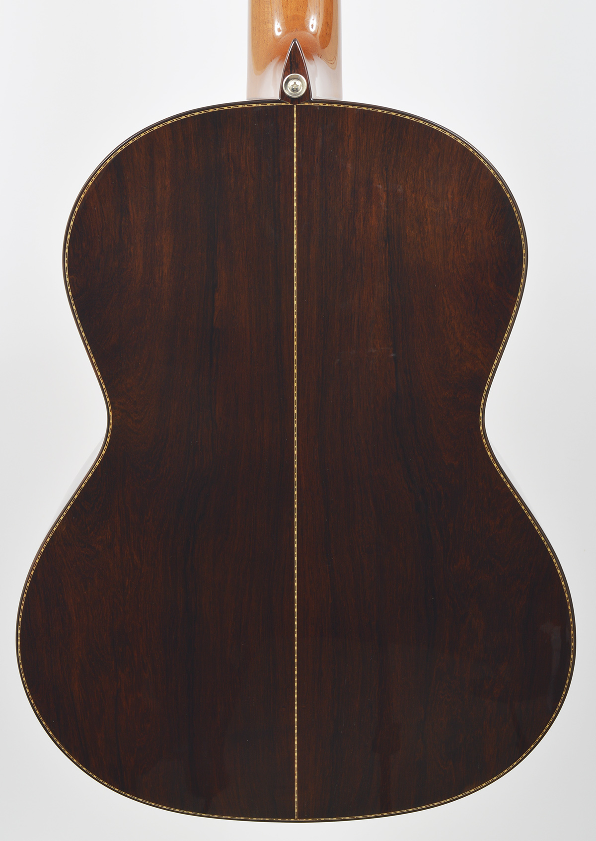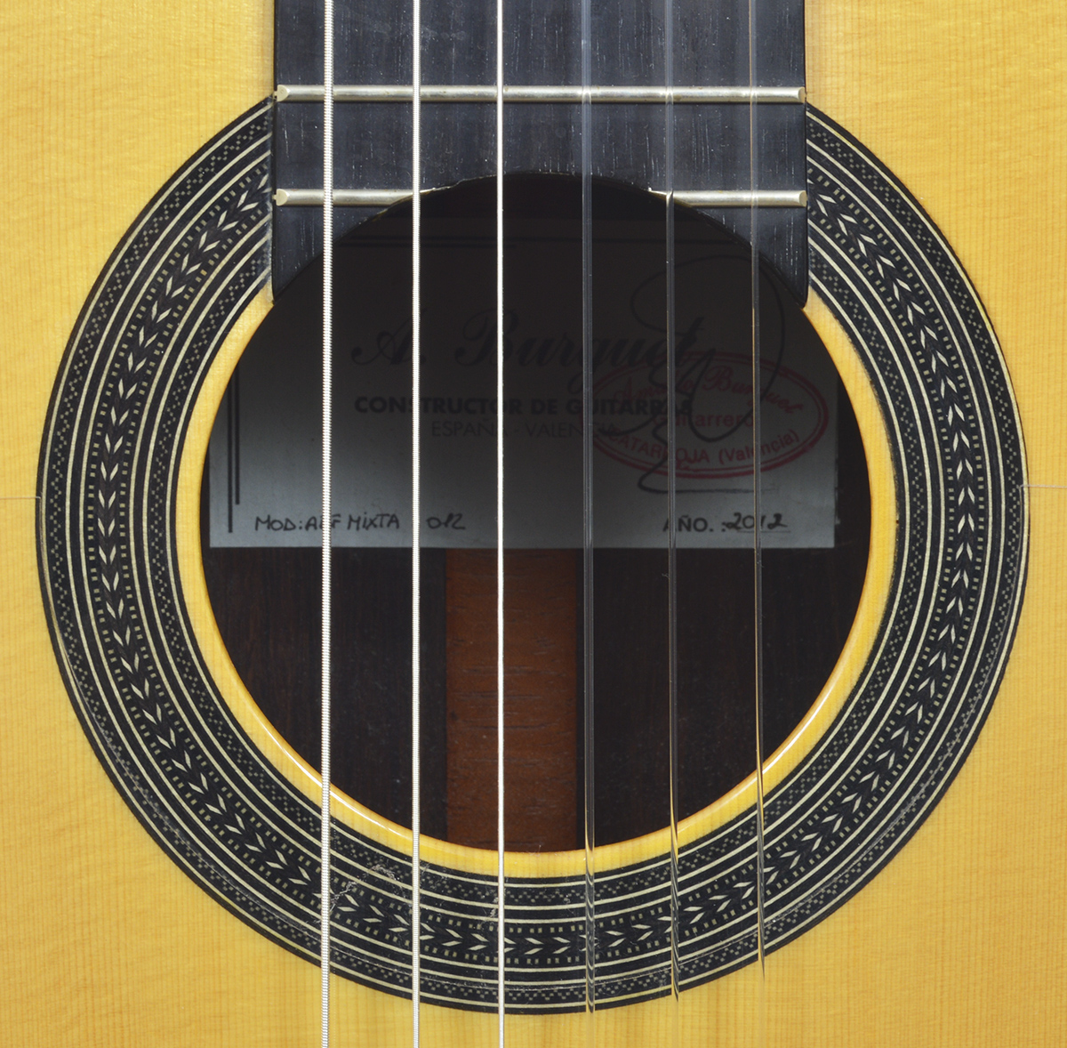 Part classical and part flamenco, this guitar has clear golpé (tapping) plates fitted, a low action, and the addition of studs to take a strap on the base and heel. The tone falls somewhere between the two in character, with a smoother treble and darker mid-range/bass than a cypress flamenco, but also a more abrupt response and less sustain than is typical of a classical instrument.