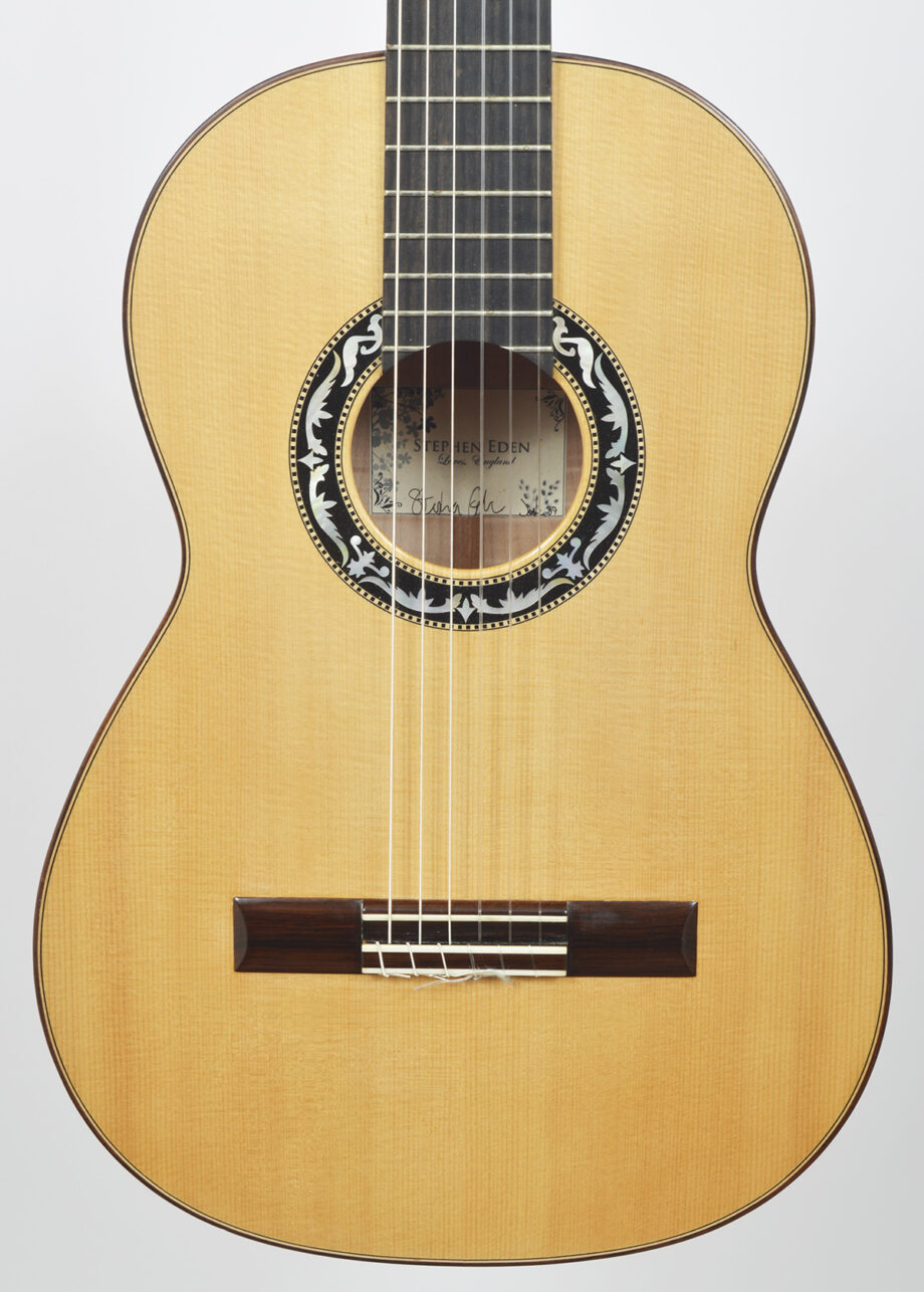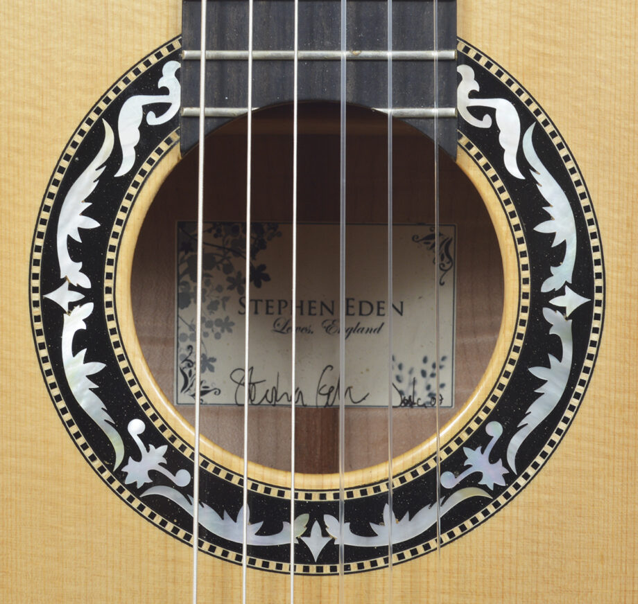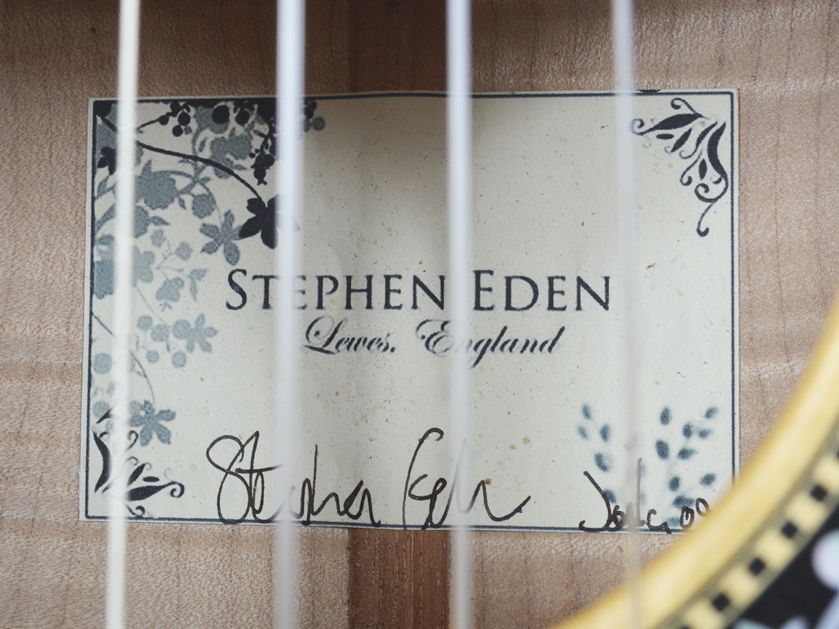 Neatly constructed by the English maker, Stephen Eden, the tone of this elegant instrument is nicely balanced; light and sweet, with a volume surprising for a smaller, non-rosewood guitar.