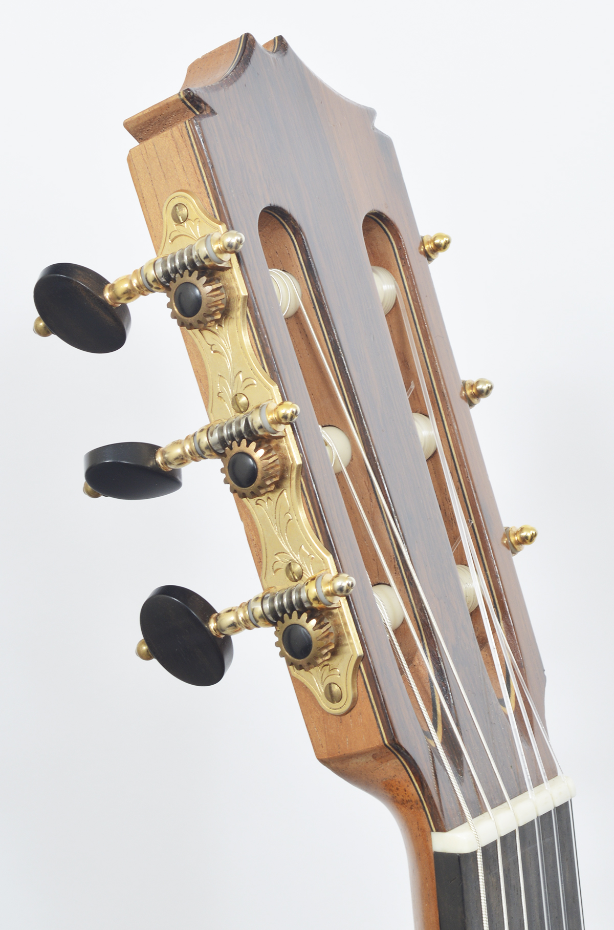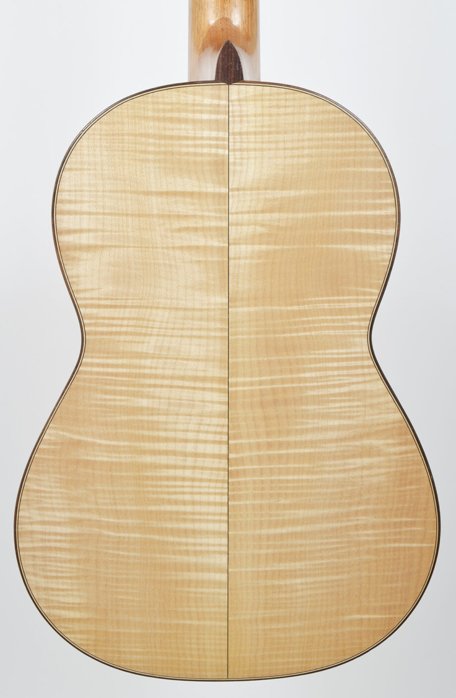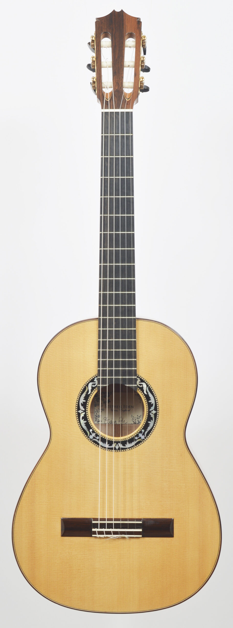 Neatly constructed by the English maker, Stephen Eden, the tone of this elegant instrument is nicely balanced; light and sweet, with a volume surprising for a smaller, non-rosewood guitar.